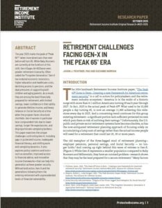 As the nation enters the Peak 65® era, new research from the Alliance for Lifetime Income’s Retirement Income Institute reveals that Generation X is at the greatest risk of an unsecure retirement. Unlike Baby Boomers, most Gen-Xers have spent their working lives without traditional pensions, relying primarily on 401(k) plans while facing major financial headwinds, including multiple recessions, soaring education and housing costs, and ongoing caregiving responsibilities for both children and aging parents. These pressures have left many with insufficient savings and low confidence that their money will last through retirement.